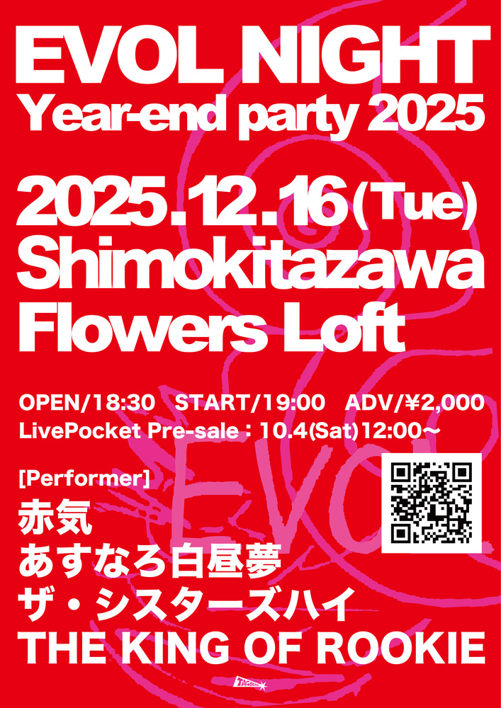 『EVOL NIGHT Year-end party 2025』 SCHEDULE 2025/12/16(火) 下北沢Flowers Loft 開場/開演 18:30/19:00 前売 ¥2,000 w/ あすなろ白昼夢 /ザ・シスターズハイ /THE KING OF ROOKIE 先行チケット URLをコピーする 報告する
