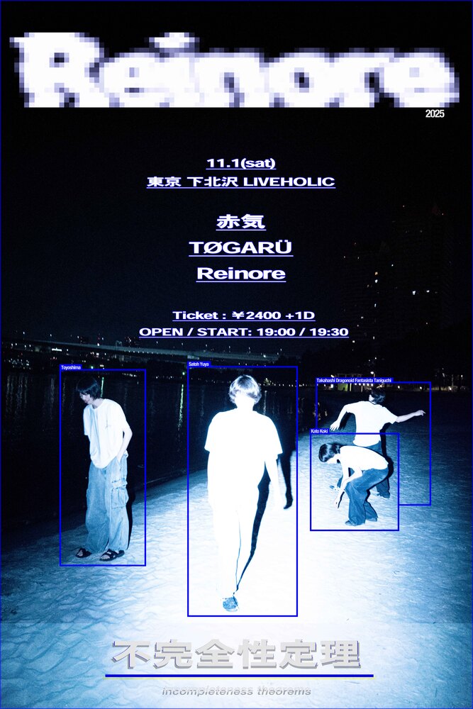 Reinore pre. 『不完全性定理』 SCHEDULE 2025/11/01(土) 下北沢LIVEHOLIC OPEN/START 19:00/19:30 Ticket : ¥2400 + 1D w/ Reinore TØGARÜ 取り置き URLをコピーする 報告する