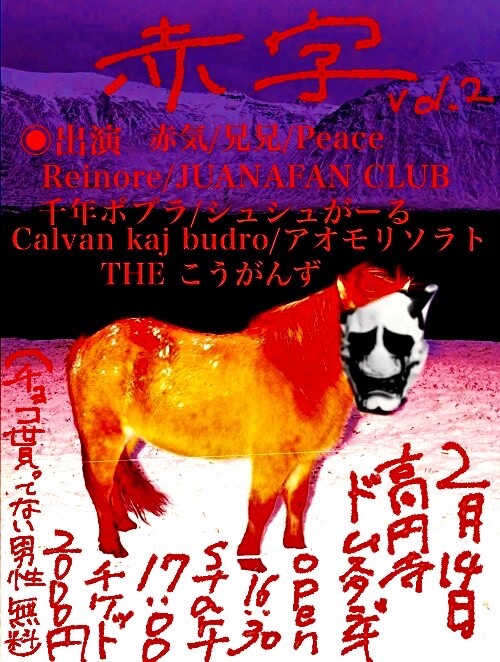 赤気自主企画「赤字」vol.2 SCHEDULE 2026/02/14(土) 高円寺ドムスタジオ OPEN 16:30 START 17:00 2000円(チョコを貰えてない男無料) ※出演者はフライヤー参照 取り置き URLをコピーする 報告する