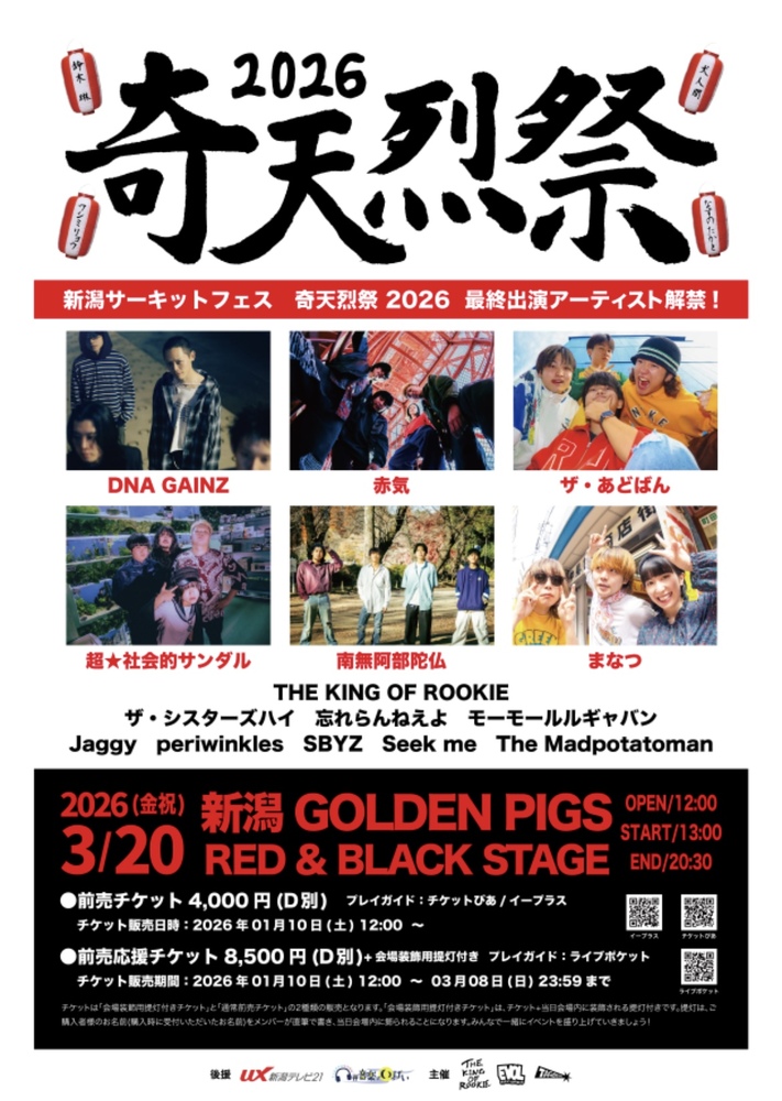 奇天烈祭 2026 SCHEDULE 2026/03/20(金) 新潟GOLDEN PIGS OPEN 12:00/ START 13:00 前売りチケット ¥4,000(D別)/ 前売り応援チケット ¥8,500(D別) ※出演者はフライヤー参照 チケット URLをコピーする 報告する