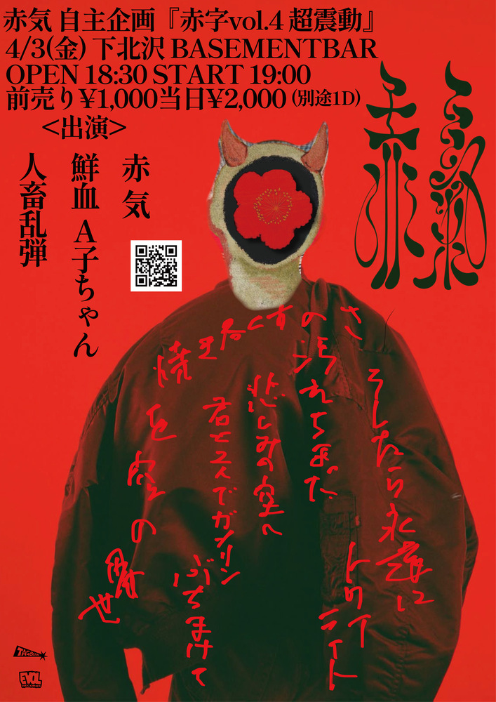 赤気自主企画『赤字vol.4 超震動』 SCHEDULE 2026/04/03(金) 下北沢BASEMENT BAR OPEN 18:30 / START 19:00 <出演> 赤気 / 鮮血A子ちゃん/人畜乱弾 前売り¥1,000(+1D) 当日¥2,000(+1D) ご予約 URLをコピーする 報告する